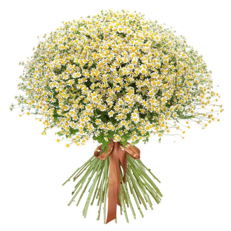 Букет состоит из 101 ветка танацетума, прозрачная упаковка, атласная лента.