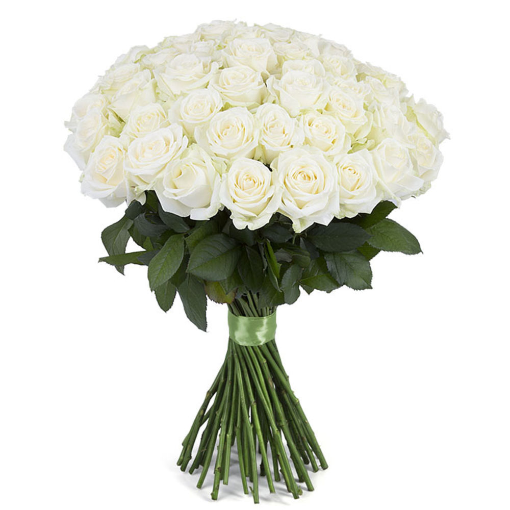 Букет состоит из 55 белых роз, прозрачная упаковка, атласная лента.