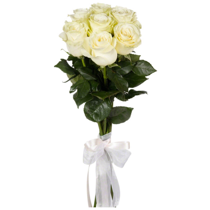 Букет состоит из 7 белых роз, прозрачная упаковка, атласная лента.